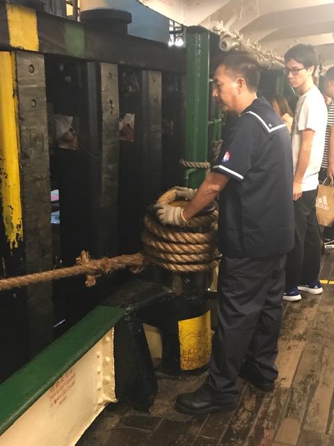 これはフェリーを埠頭に泊めておいた2本の大縄を、セーラー服の水兵さんが外すところ。星のマークが施されたネイビーブルーのセーラー服も、スターフェリー登場の1888年当時からほぼ変わらずこのデザインだそうです。
